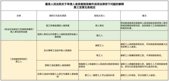 这里的帮工人主要是指为他人提供帮助的“好人”,通过上表我们可以看出,帮工人如果在帮工活动中遭受人身损害,应根据帮工人和被帮工人各自的过错承担相应的责任;因第三人的行为遭受人身损害,被帮工人可予以适当补偿,补偿后可以向第三人追偿。但是,帮工人在帮工活动中不管是致人损害或者因此遭受人身损害,只要被帮工人明确拒绝帮工的,可不承担赔偿责任。