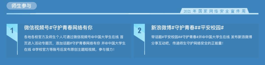 10月11日至21日,教育部指导中国大学生在线、腾讯微信共同发起“守护青春 网络有你”线上视频号话题,各地各校师生可通过微信视频号@中国大学生在线 首页进入活动专题页,添加话题#守护青春网络有你,并@中国大学生在线 @微信派 @学校官方账号后发布原创主题短视频(包括情景短剧、动画视频、原创歌曲等题材),参与话题接力,发挥矩阵传播优势,强化宣传教育效果。