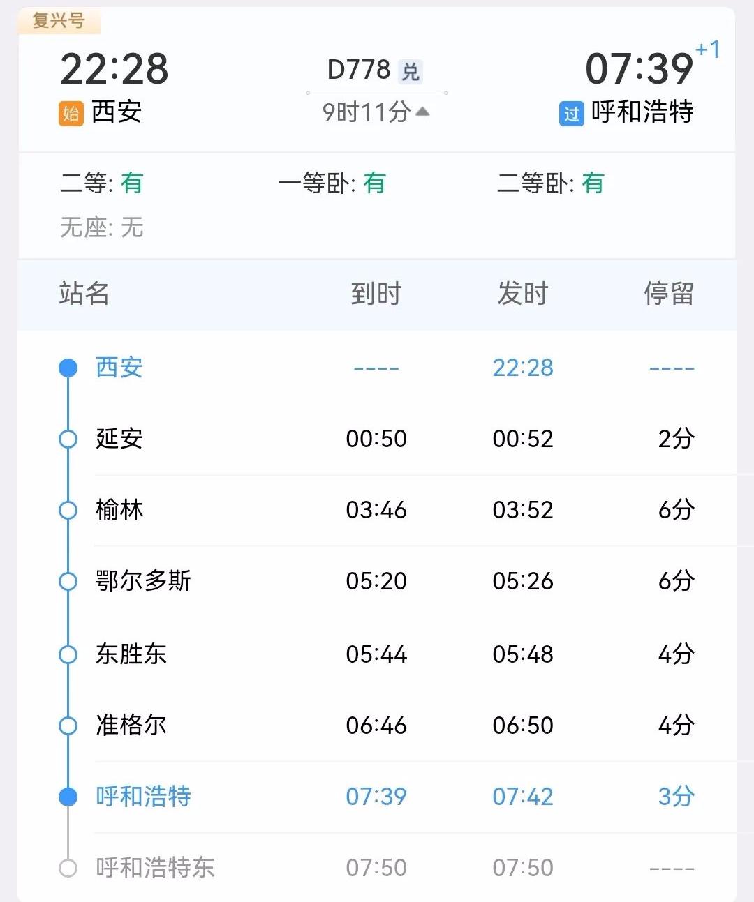 西安—呼和浩特东D778次
