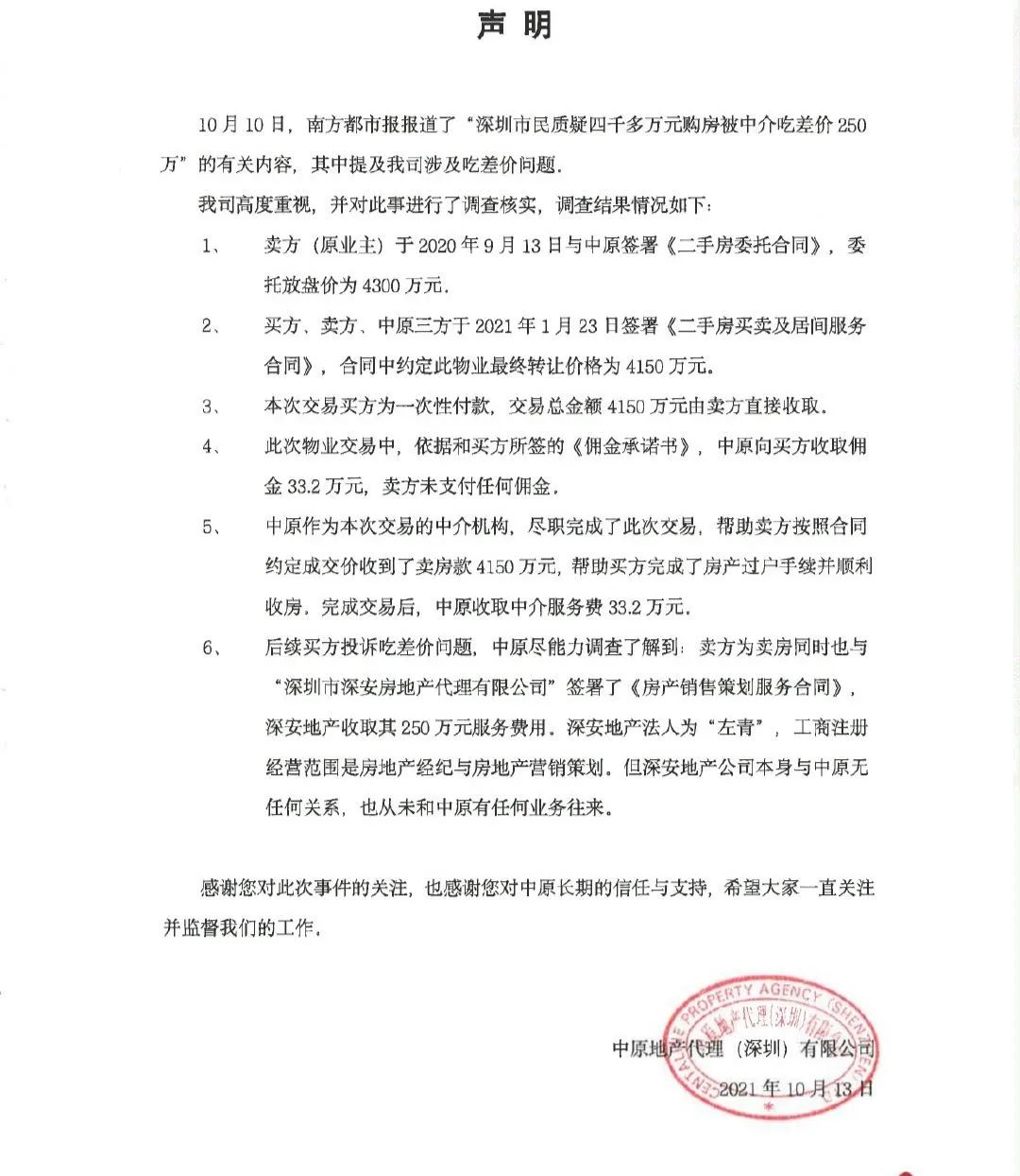 日前,海报新闻报道了深圳夏女士4150万购买豪宅自称被吃250万差价一事,引发广泛关注。10月13日,中原地产代理(深圳)有限公司(以下简称“深圳中原地产”)发布声明,称夏女士房产原业主为卖房同时也与深圳市深安房地产代理有限公司(以下简称“深安地产)签署了《房产销售策划服务合同》,深安地产收取其 250 万元服务费用。深安地产公司本身与中原无任何关系,也从未和中原有任何业务往来。