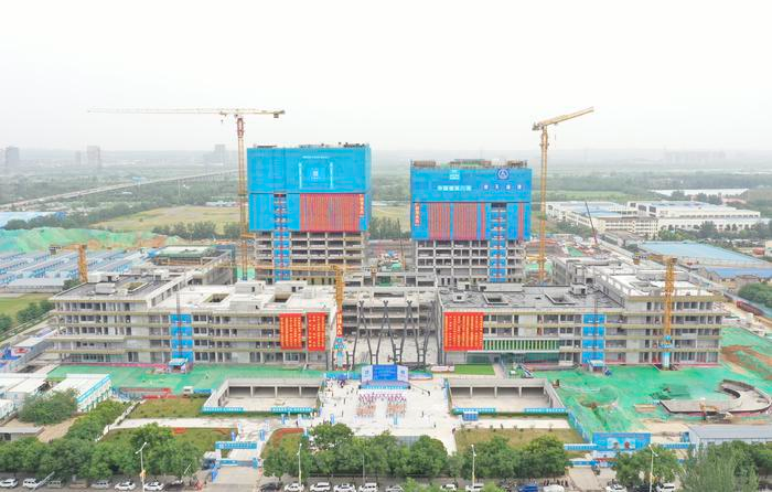 西安市红会医院高铁新城院区项目东区已顺利封顶,市红会医院高铁新城院区项目,位于经开区秦汉大道南北段西侧、尚苑路北侧、文景山公园东侧。净用地面积314亩,总建筑面积约68万平方米。主要功能包括门诊部、急诊急救中心、住院部、医技部、国际医学部等,其中住院部为4栋病房楼,2栋为1500床骨科医院病房楼,2栋为1500床综合医院病房楼。