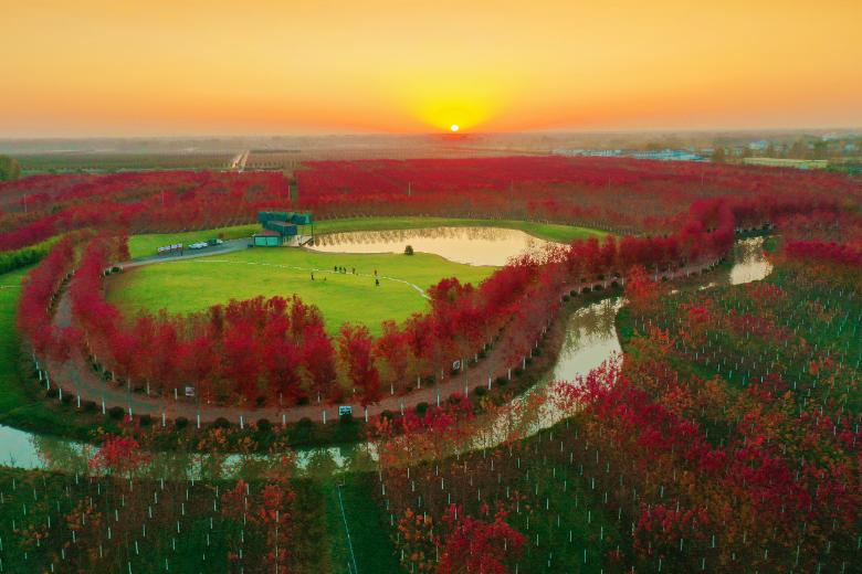 徐州红枫公园占地约1万亩。以种植彩色树种为主,植物繁茂,空气清新,环境优美,是“城市天然氧吧”。深秋时节,60余万株枫树被红色覆盖,色彩缤纷的田园风光吸引众多游人看叶赏景,领略“树”造多彩世界,“叶”摹田园风情的美景。