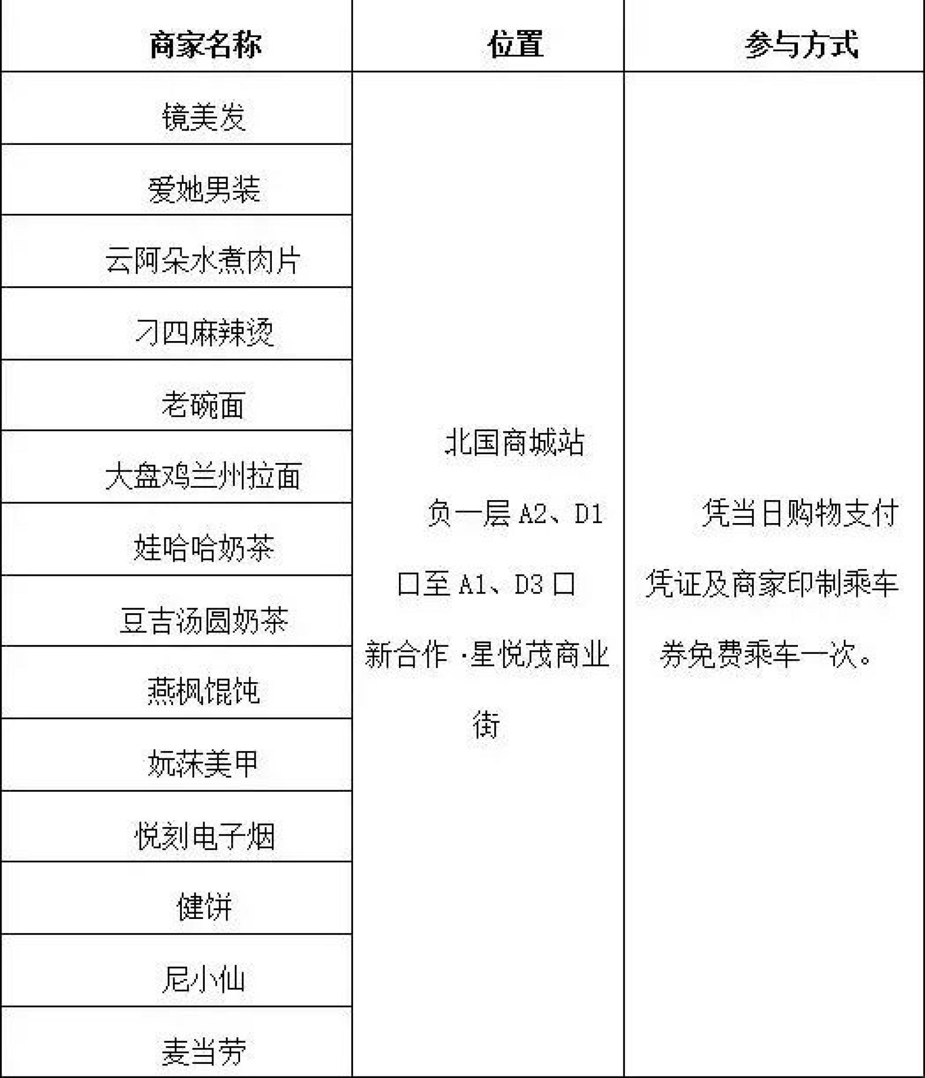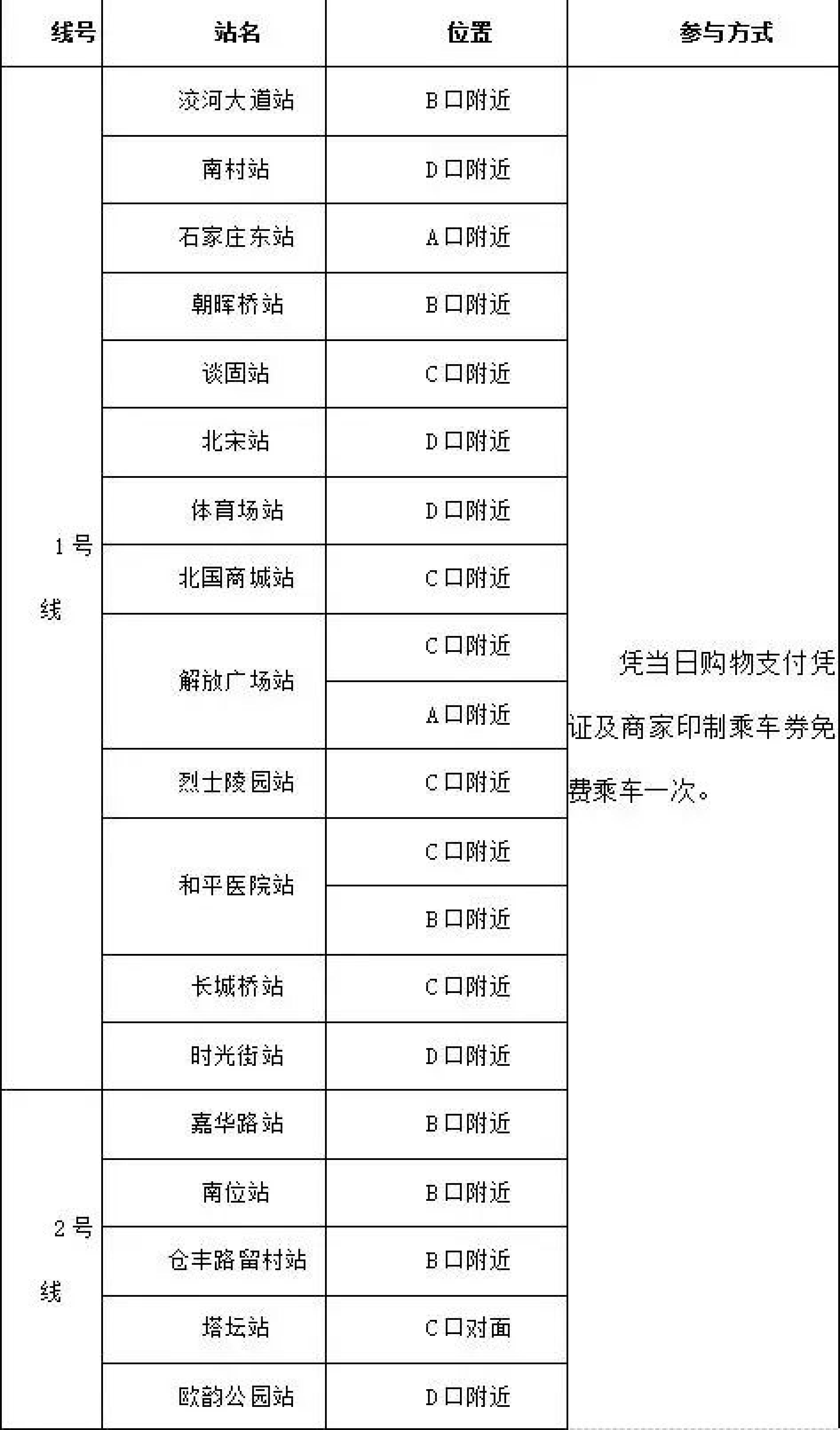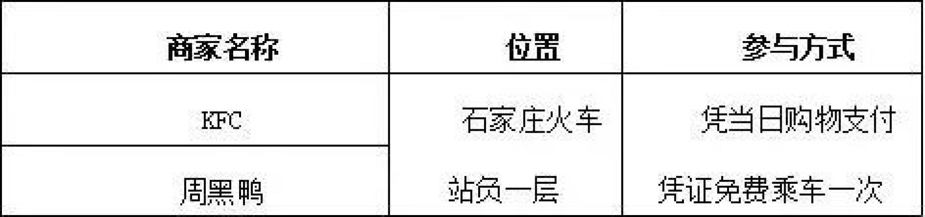 活动期间,市民在地铁站内指定商铺购物,可凭当日消费凭证+乘车券(石家庄站KFC、周黑鸭凭当日消费纸质凭证),免费乘坐地铁一次。仅限当日当次使用,逾期作废(从专用通道进入,乘车不限里程。出站时,请主动出示消费凭证消费凭证+乘车券,工作人员登记“已乘车”字样,即可出站。)