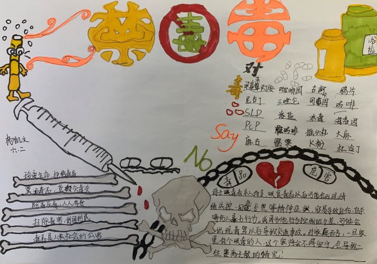 在老师的指导下,同学们纷纷开动脑筋,根据自身的理解和课外资料的补充,用图画和文字绘制出一张张禁毒主题手抄报,来表达“健康人生,绿色无毒”的认知。