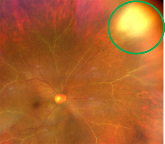 究竟是什么原因引起的呢?市一医院葡萄膜炎团队在经过会诊后,决定采用秘密武器——广角眼底照相机。和一般个眼底照相机比,光角相机能更大范围地拍到眼底全部情况。这下,一个藏在黄斑区边上的白色病灶出现在了李医生的视野里。经过眼内液检查证实,她的弓形虫抗体呈阳性,结合眼部的病变特点,考虑患者为弓形虫感染。