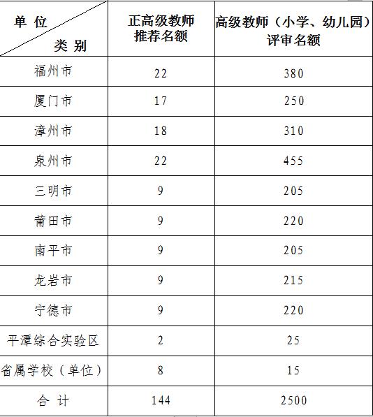 正高级教师、高级教师(小学、幼儿园)推荐名额