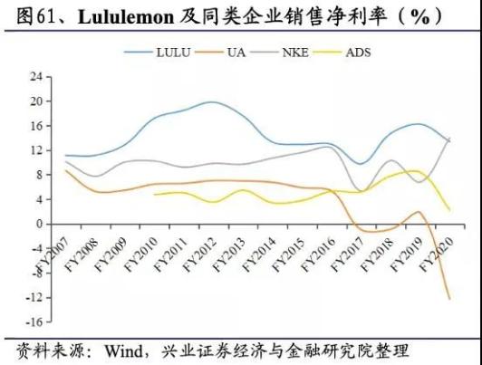 品牌收入增长亮眼的背后可能是销售人海战术和广告铺天盖地的高昂成本,但lululemon的销售毛利率和销售净利率水平均更高,也就是说,lululemon每卖出一元,赚回的净利润比同类企业更高。