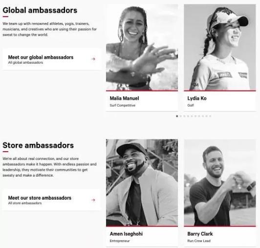 lululemon的品牌大使现包括全球大使和门店大使。截止2021年9月20日,lululemon全球大使共55位,囊括了瑜伽、冥想、游泳、马拉松、拳击等领域的杰出运动员。门店大使范围更宽泛,共1303位,包括企业家、演讲者、营养师、音乐家等各个领域的代表人物。