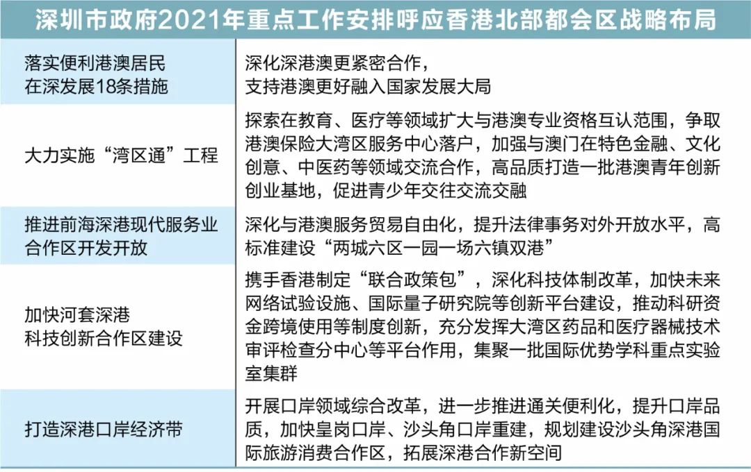实际上,对于深港合作,深圳方面一直都有积极作为。今年5月深圳市政府工作报告中提及“十四五”时期发展目标和重点任务时,对深港合作就有重点着墨。比如报告指出,强化基础设施“硬联通”和规则机制“软联通”,促进人员、货物、资金、技术、信息等各类要素高效便捷流动等。
