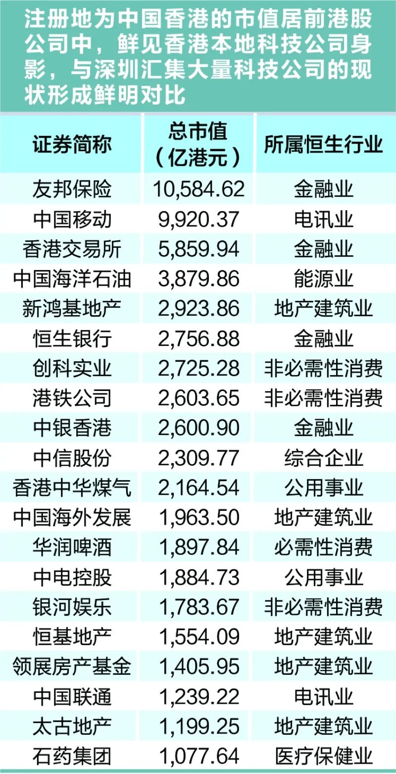 体现在资本市场上,证券时报记者据Wind数据统计,注册地为中国香港的市值居前港股公司中,除了中国移动、华润啤酒、中国联通等业务主要在内地的通信、消费类公司外,香港本土的大型上市公司主要集中在金融业、地产建筑业等行业,同时鲜见香港本地科技公司身影,这与深圳汇集大量科技公司的现状形成较明显对比。