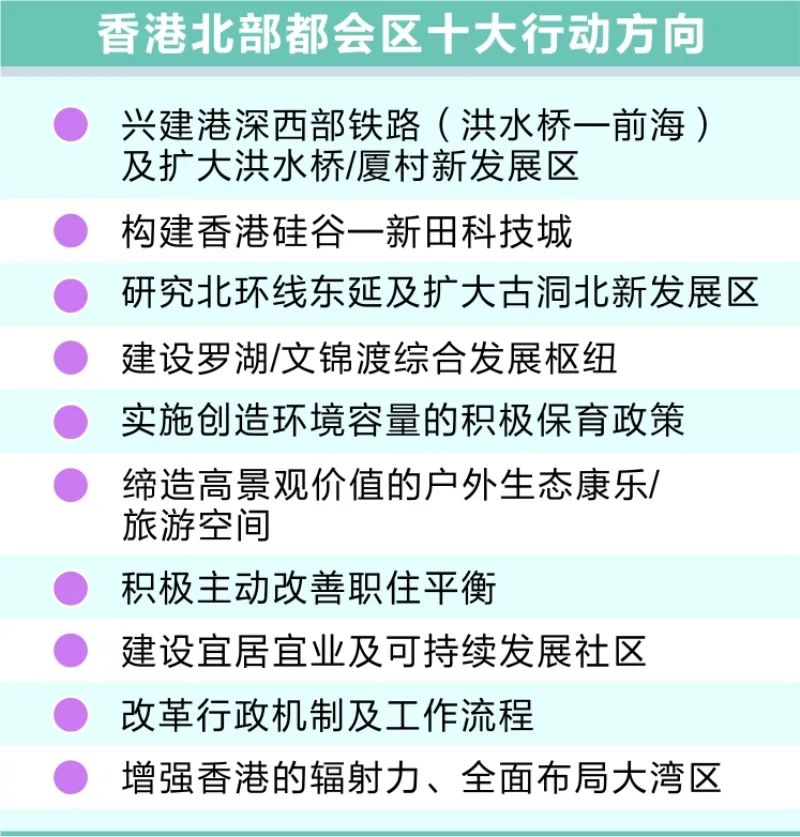 近日,香港特别行政区行政长官林郑月娥发表《施政报告》时透露,香港特区政府将在香港北部建设一个300平方公里的都会区,配合深港跨境口岸和交通基建,与深圳形成“双城三圈”的战略性布局。全面落实北部都会区发展计划需时20年。“对于港深合作,从来没有写得这么多。”