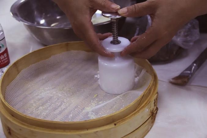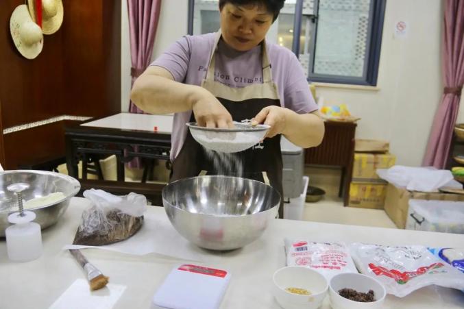 重阳糕大多是用糯米粉做的,黏性比较大,老年人咀嚼困难、吞咽不易。这款重阳糕采用了与松糕类似的制作方式,用粳米和糯米配比后磨成粉,口感更为松软。“我们还将小米添加进了配料当中,口感好还有助于消化。”嘉定工业区蔷薇社区居民王阿姨介绍。