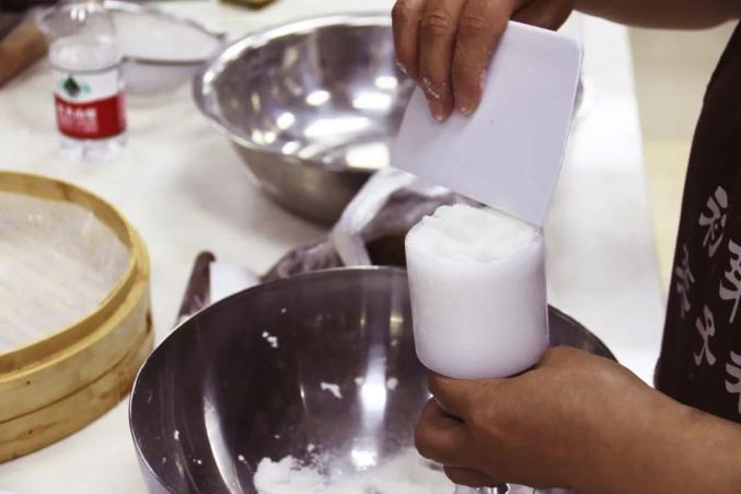 4、将过筛好的细粉放进模具,并加入馅料,再用细粉盖住馅料,按实之后用刮刀将多余的细粉刮去。