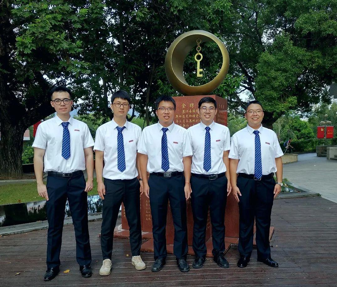 福建师大物理竞赛工作室教练团队合影,从左至右:蔡宗涛,朱凤龙,陈新光,温伟伟,郑荣炜。