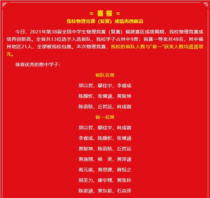 据福建师范大学附属中学介绍,该校今年物理竞赛成绩再创新高,共有9位学生入选省队;省赛一等奖共48名,其中福州地区21人,全部为师大附中学生。本次物理竞赛,该校的省队人数与“省一”获奖人数均遥遥领先。