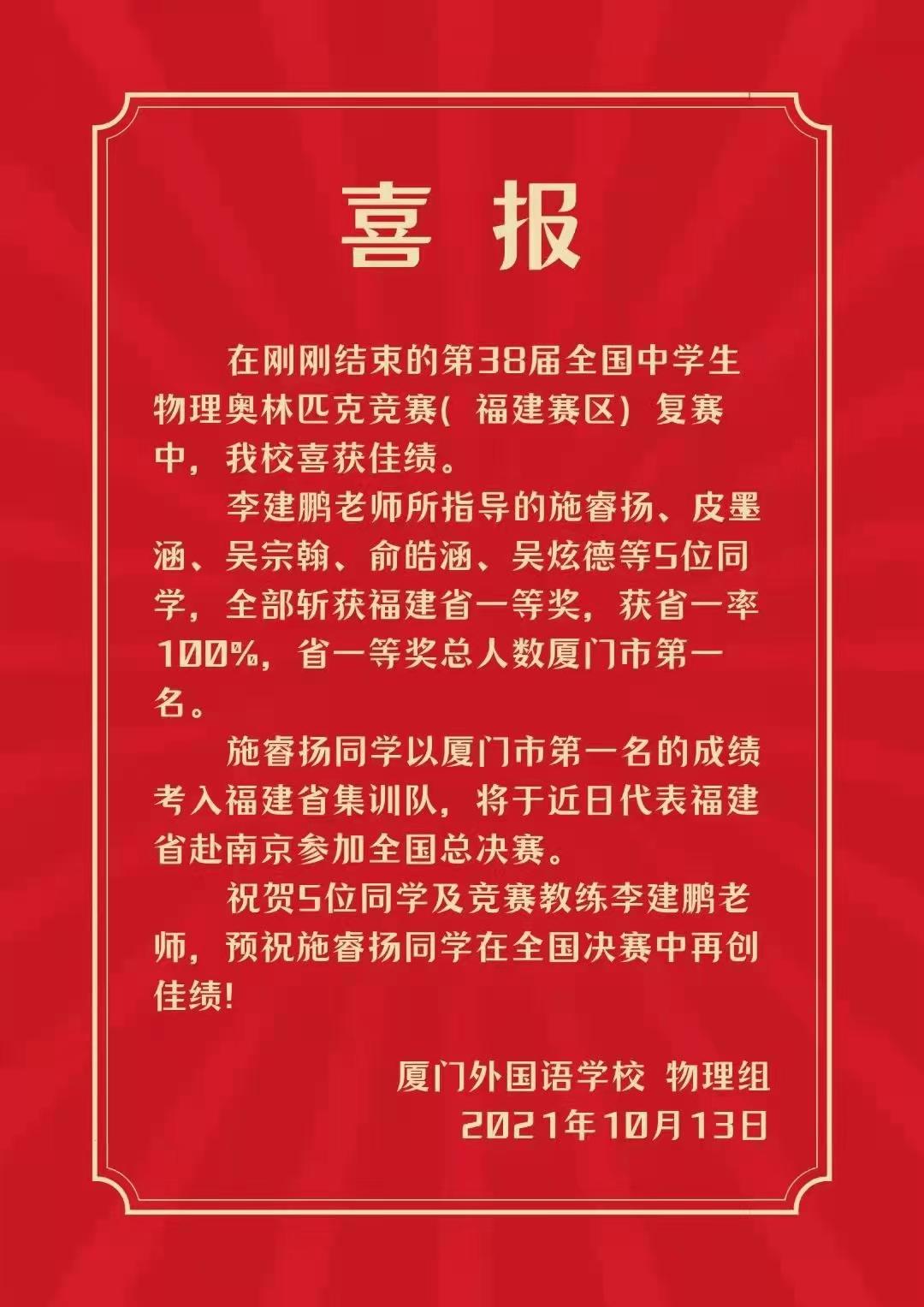 日前,2021年第38届全国中学生物理竞赛(复赛)福建赛区成绩揭晓。据悉,今年物理省队扩容,全省共13位选手入选省队,他们将参加10月23日开始举行的第38届全国中学生物理竞赛。