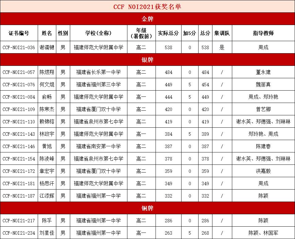 在2021年7月底,高考投档录取正火热之际,福建师大附中高二学生(暑假前)谢濡键,以538分成绩获得全国青少年信息学奥林匹克竞赛金牌第36名,并入选CCF NOI2021国家集训队,保送清华大学。