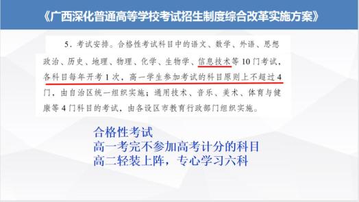 此外,广西新高考改革采用“3+1+2”模式,即全国统考科目为语文、数学、外语3门,选择性考试科目由考生从物理和历史2门科目中任选1门,从思想政治、地理、化学、生物学4门科目中任选2门。“这一轮高考综合改革是1977年恢复全国统一高考以来最全面、最系统、最深刻的一次考试招生制度改革。”苏敏说。