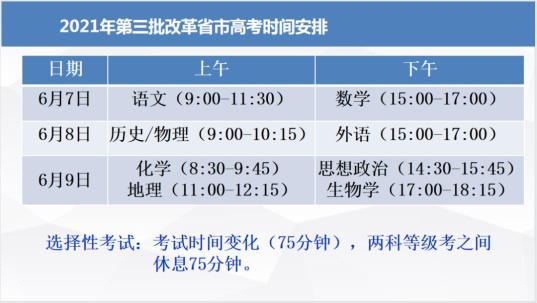 根据2021年第三批改革省市高考时间,6月7日上午进行语文考试,下午进行数学考试;6月8日上午进行历史或物理考试,下午进行外语考试;9日上午进行化学和地理考试,下午进行思想政治和生物学考试。其中选择性科目考试时间变为每门75分钟,两科等级考试之间休息75分钟。