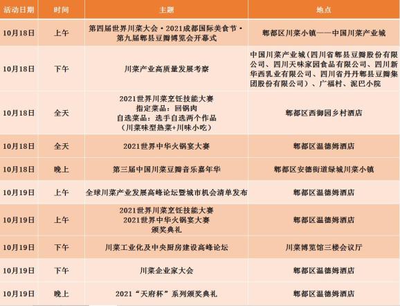 郫都区将围绕川菜及相关产业链的供需发展,发布今年首批《城市机会清单》。同时,《国际川菜经典菜肴制作工艺规范》(2021-1)、《郫都饮食文化·知味郫都》、“郫县豆瓣”产地标志、2021中餐工业化科技创新成果、《安德乡村振兴机会清单》等一批重要成果也将在会期进行全球发布。