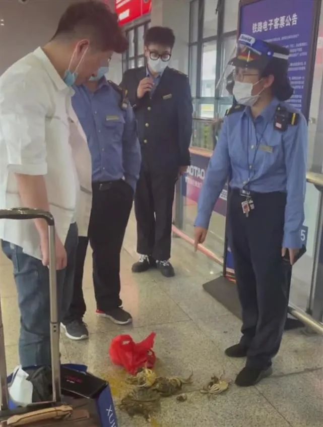 10月14日下午,浙江省永康南站内,一名男乘客携带一袋活螃蟹乘高铁时,乘务员进行了劝阻,男子当场踩死螃蟹后带上车。