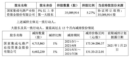今年7月份,兆易创新也曾发公告称,在减持计划实施期间内,大基金通过集中竞价交易方式累计减持公司股份1131.81万股,占公司总股本的2%。截至该公告披露日,大基金持有公司股份3508.99万股,占公司总股本的5.28%。