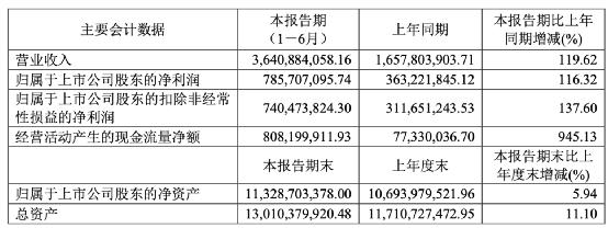 中报显示,今年上半年,兆易创新实现营收36.41亿元,同比增长119.62%;归母净利润7.86亿元,同比增长116.32%;扣非净利润7.4亿元,同比增长137.6%。基本每股收益1.19元。