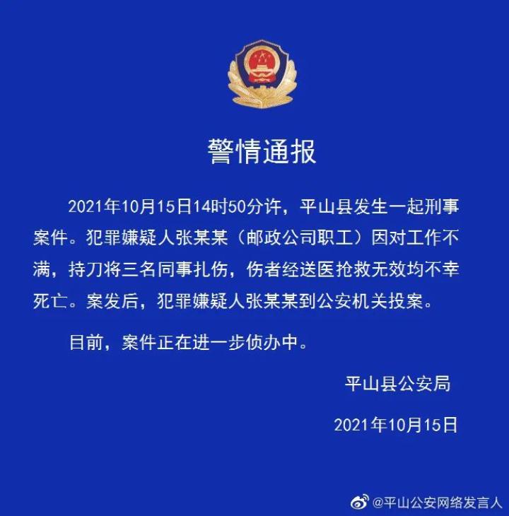 据@平山公安网络发言人 消息,2021年10月15日14时50分许,河北省石家庄市平山县发生一起刑事案件。犯罪嫌疑人张某某(邮政公司职工)因对工作不满,持刀将三名同事扎伤,伤者经送医抢救无效均不幸死亡。案发后,犯罪嫌疑人张某某到公安机关投案。目前,案件正在进步侦办中。