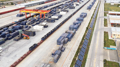 9月23日,在呼和浩特货运中心沙良物流园内,两台正面吊正往来穿梭,吊起白色的罐式集装箱装上专用平车。4小时后,满载着散装水泥的集装箱列车将沿唐包铁路奔向京津冀地区,助力当地建设。