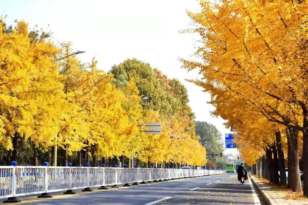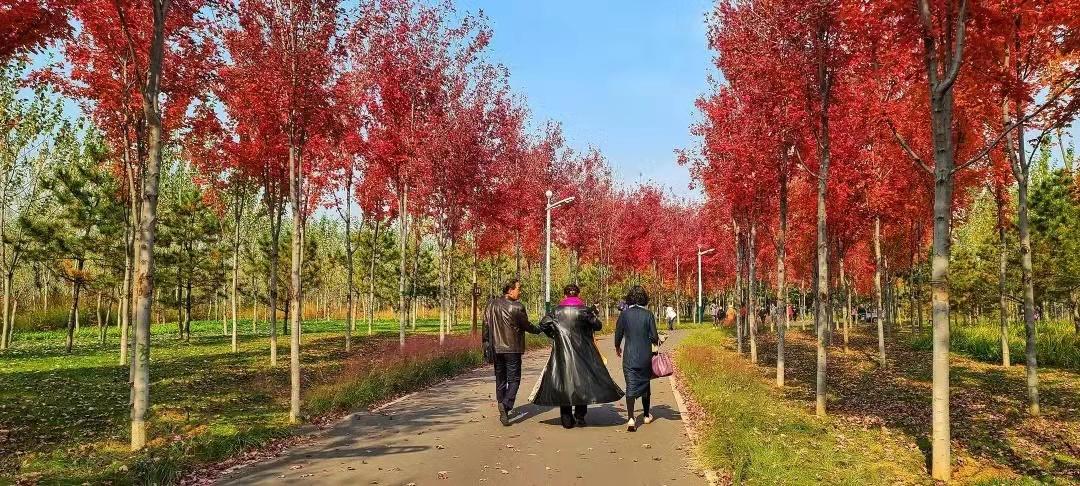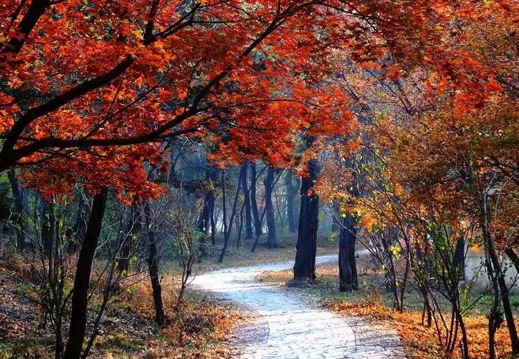 每年这个时候,杨树绿叶未落、柳叶已经发黄、红枫灿若朝霞,远远看上去,明黄、橙红、葱绿……颜色碰撞得特别有层次!