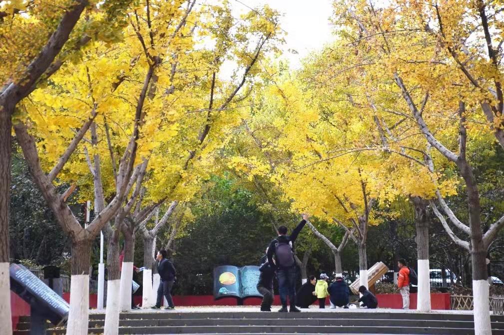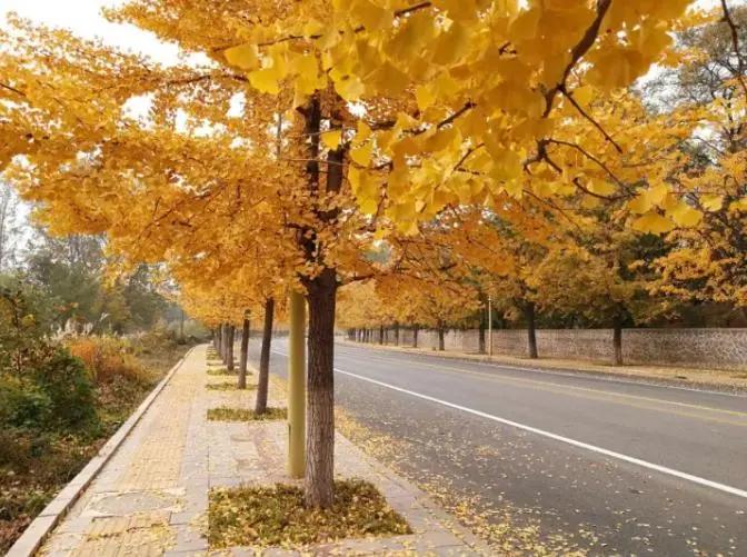 秋天里金黄灿烂的银杏叶也甚为惹眼,银杏叶随风飘落,在地上铺了厚厚一层,有一种童话世界中浪漫的感觉。