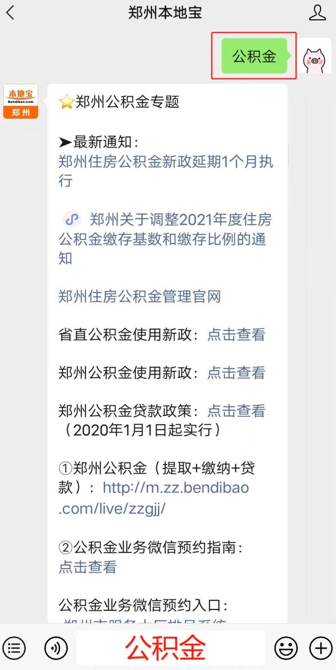 在微信聊天对话框发送“公积金”,即可获取公积金政策最新通知,公积金提取、缴纳、贷款、线上预约入口、余额查询等业务办理指南!
