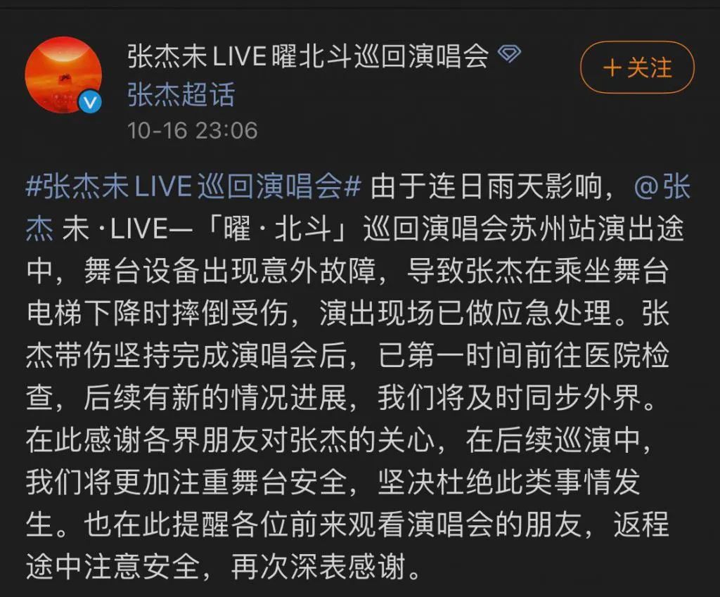 10 月 16 日 23:06 分,张杰未 LIVE 曜北斗巡回演唱会官方微博发布消息称:由于连日雨天影响,@张杰未 LIVE 曜北斗巡回演唱会 苏州站演出途中,舞台设备出现意外故障,导致张杰在乘坐舞台电梯下降时摔倒受伤,演出现场已做应急处理。