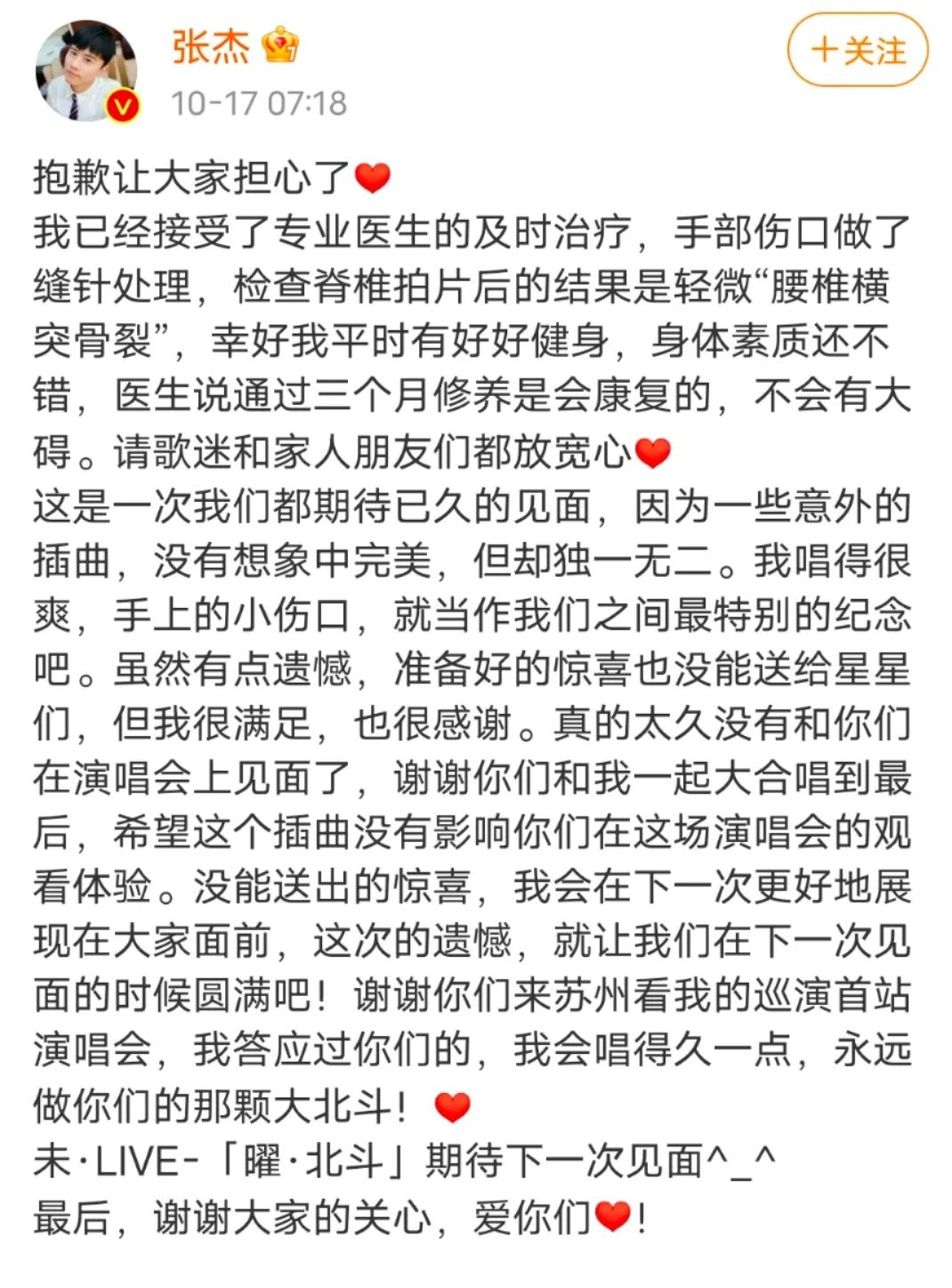 17日7点18分,张杰微博发文回应演唱会受伤意外:“已经接受了专业医生的及时治疗,手部伤口做了缝针处理,脊椎拍片后的结果是轻微腰椎横突骨裂,医生说三个月修养是会康复的,不会有大碍。请歌迷和家人朋友们放宽心。”