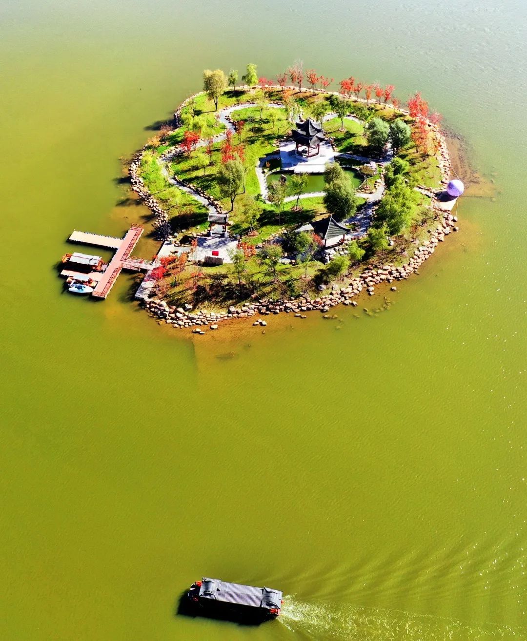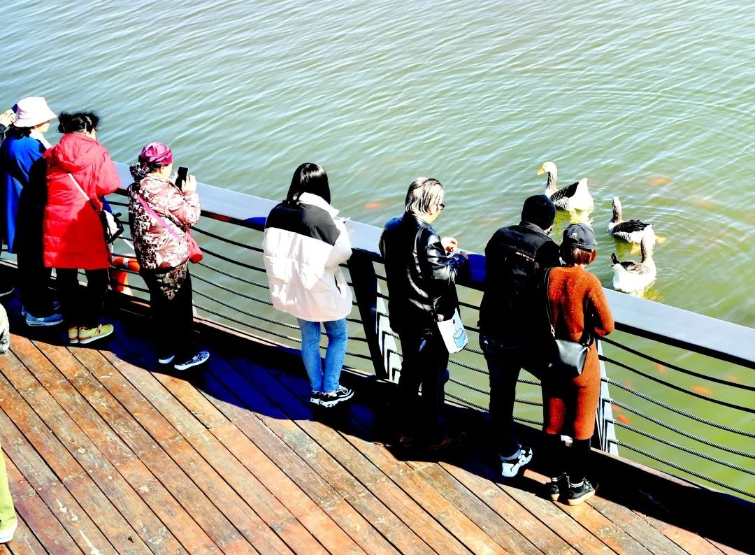在牵手码头坐上画舫游船,近距离观赏梅花岛、禹门岛,如果运气好的话,还能看到黑天鹅和野鸭子戏水的画面。