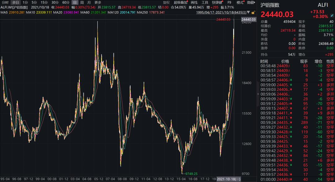 上周五夜盘,沪铝指数再度走高,盘中一度大涨1.5%,突破了2006年的高点,盘中创出历史新高,最高报价达24719.34元/吨。拉长周期来看,今年1月至今,沪铝指数累计涨幅已高达66%。