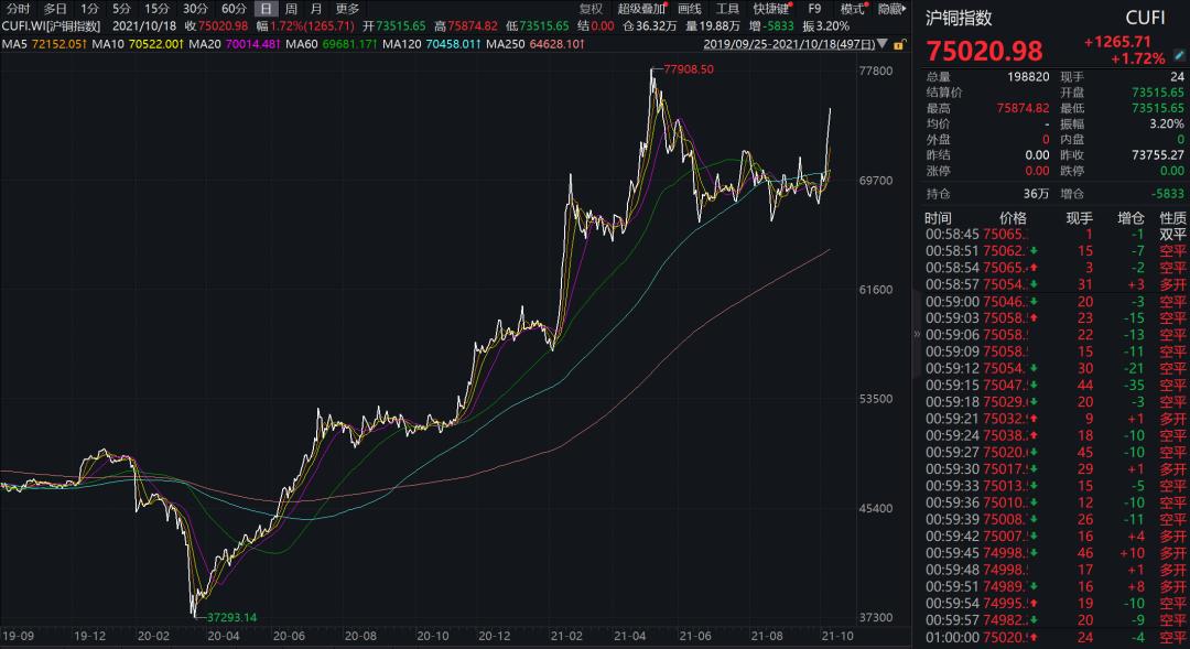 横盘三个月后,沪铜期货指数再度崛起,斩获3连阳。上周五夜盘收盘,沪铜指数再涨1.72%,报75020.98元/吨,正在逼近前期高点。