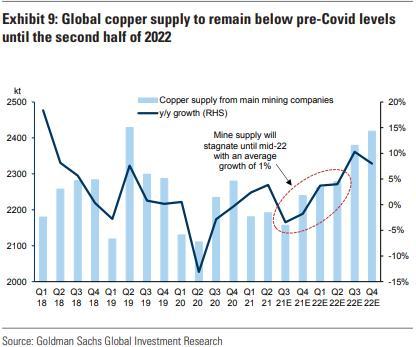 另外,铜矿的开采进入多季度停滞阶段,高盛指出,自去年第三季度,铜矿开采量趋于平稳,在去年12月份达到峰值。今年以来,开采量连续小幅下降。高盛预计,今年下半年全球矿产供应增长将放缓,直到2022年下半年才会有所回升。