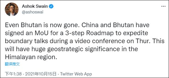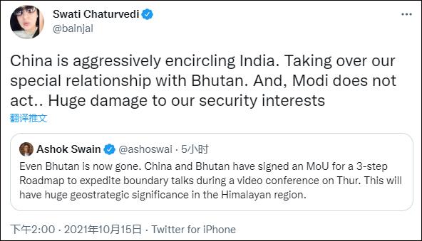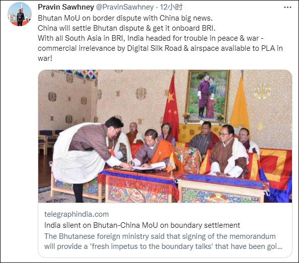 他14日发布推文声称,在中国和不丹解决边界问题后,不丹将会加入“一带一路”,随后叫嚣印度和整个南亚将因中不边界谈判进展“陷入麻烦之中”。
