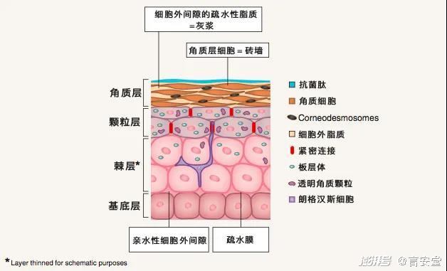 对于皮肤来说,调控吸收的主要部位在我们皮肤最外层-角质层。就像房屋需要墙壁遮风挡雨的保护作用,我们皮肤也有自己的[砖墙样结构]。角质层中的角质形成细胞有序排列如同砖块,细胞间的脂质(主要为神经酰胺、胆固醇、游离脂肪酸等)和天然保湿因子如同灰浆,“灰浆”把“砖块”紧密联结起来,形成皮肤稳定的保护结构,具有维持皮肤正常屏障、吸收、防护等作用。