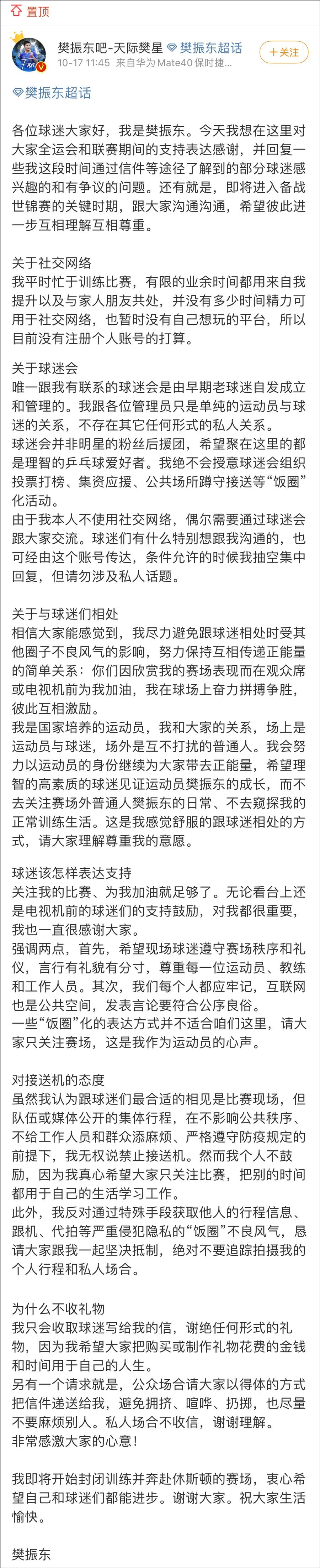 17日,樊振东通过球迷会微博账号@樊振东吧-天际樊星 发布长文,称自己平时忙于训练比赛,有限的业余时间都用来自我提升、与家人朋友共处,并没有多少时间精力可用于社交网络,也暂时没有自己想玩的平台,所以目前没有注册个人账号的打算。