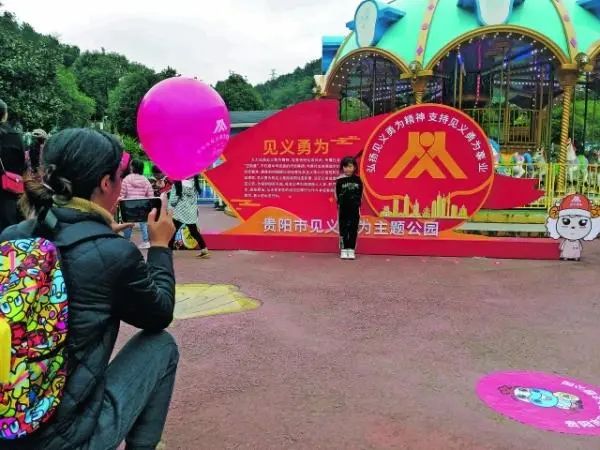 市民在贵阳市见义勇为主题公园游玩拍照。