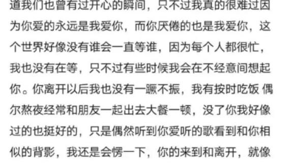 “你爱的永远是我爱你,而你厌倦的也是我爱你……只是偶然听到你的听的歌,看到和你相似的背影,我还是会愣一下……”