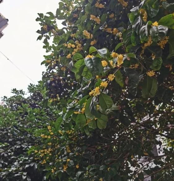 在小区门口,记者看到,4棵桂花树,枝头均挂满了小花,香味扑鼻。靠外面的几株则花色更深,带橙黄色,气味更加浓郁。