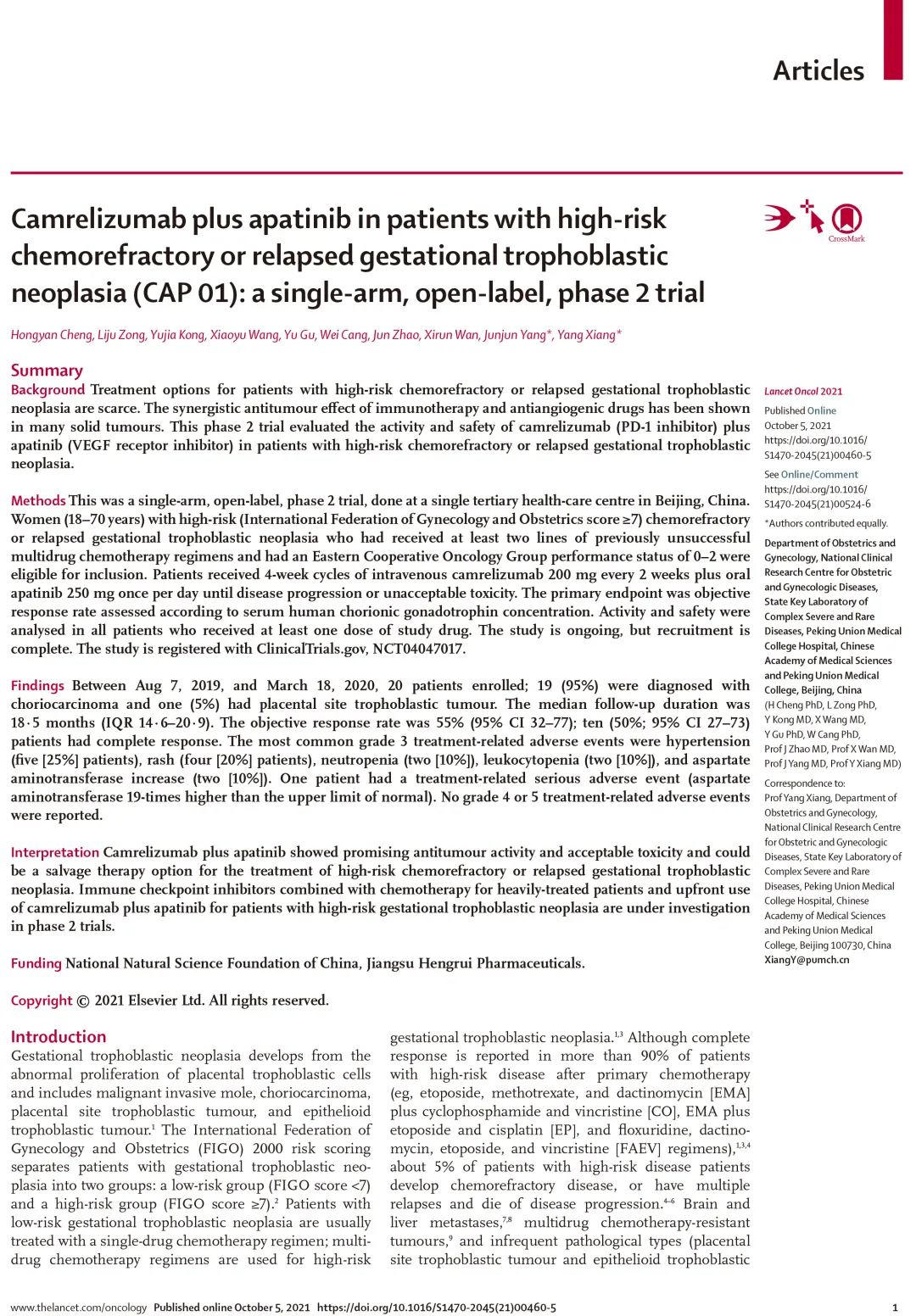 近日,北京协和医院妇科肿瘤中心向阳主任团队在《柳叶刀·肿瘤学》(The Lancet Oncology)杂志在线发表前瞻性CAP01研究,该研究应用我国优质原研药卡瑞利珠单抗(免疫检查点抑制剂)联合阿帕替尼(抗血管生成药物)治疗高危耐药/复发妊娠滋养细胞肿瘤(GTN)患者,为高危耐药/复发GTN患者带来了新的希望。这是全球范围内首个免疫检查点抑制剂联合抗血管生成药物治疗高危耐药/复发GTN的前瞻性Ⅱ期临床试验研究,并包含了迄今为止单一机构报告该罕见疾病的最大样本量。