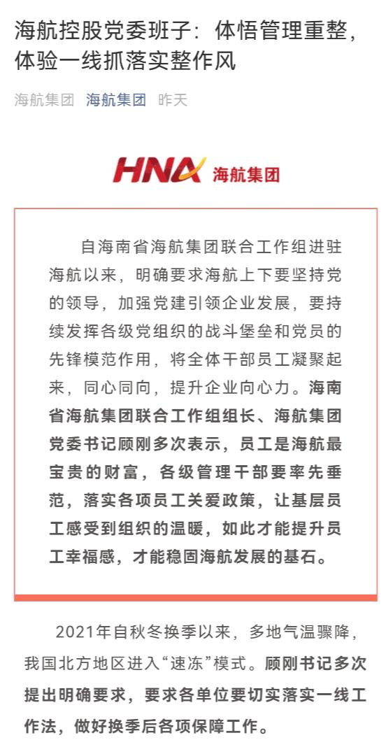 10月17日,海航集团官方微信号发布文章《海航控股党委班子:体悟管理重整,体验一线抓落实整作风》。