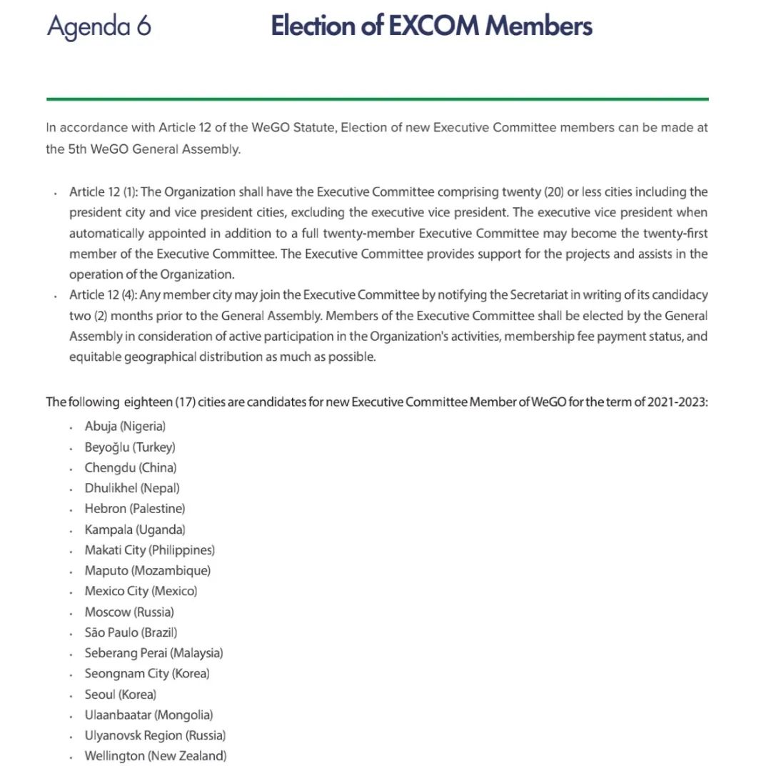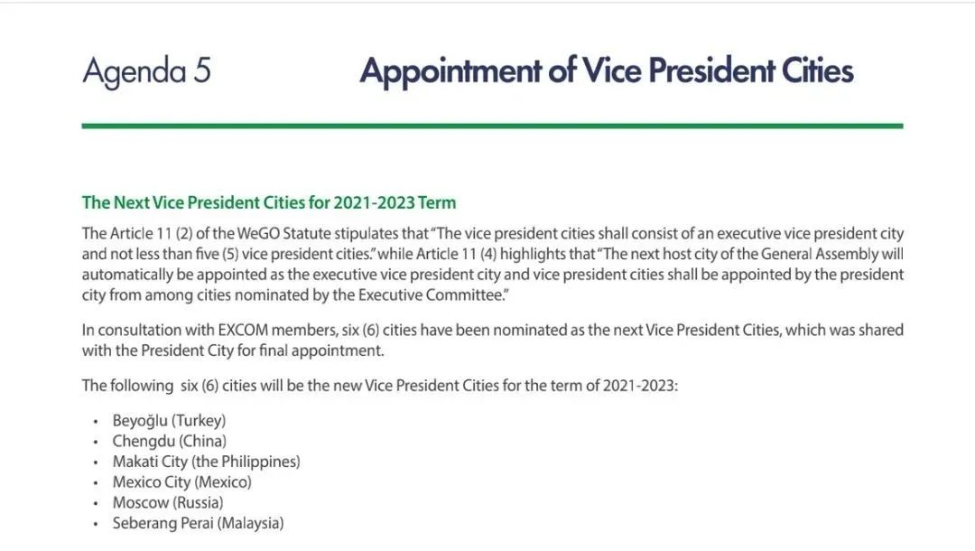 2012年,成都市加入WeGO,一直担任WeGO执委会成员城市。在本次全体大会上,成都当选为副主席城市,将在智慧可持续领域的决策酝酿、参与全球治理中扮演更重要的角色。