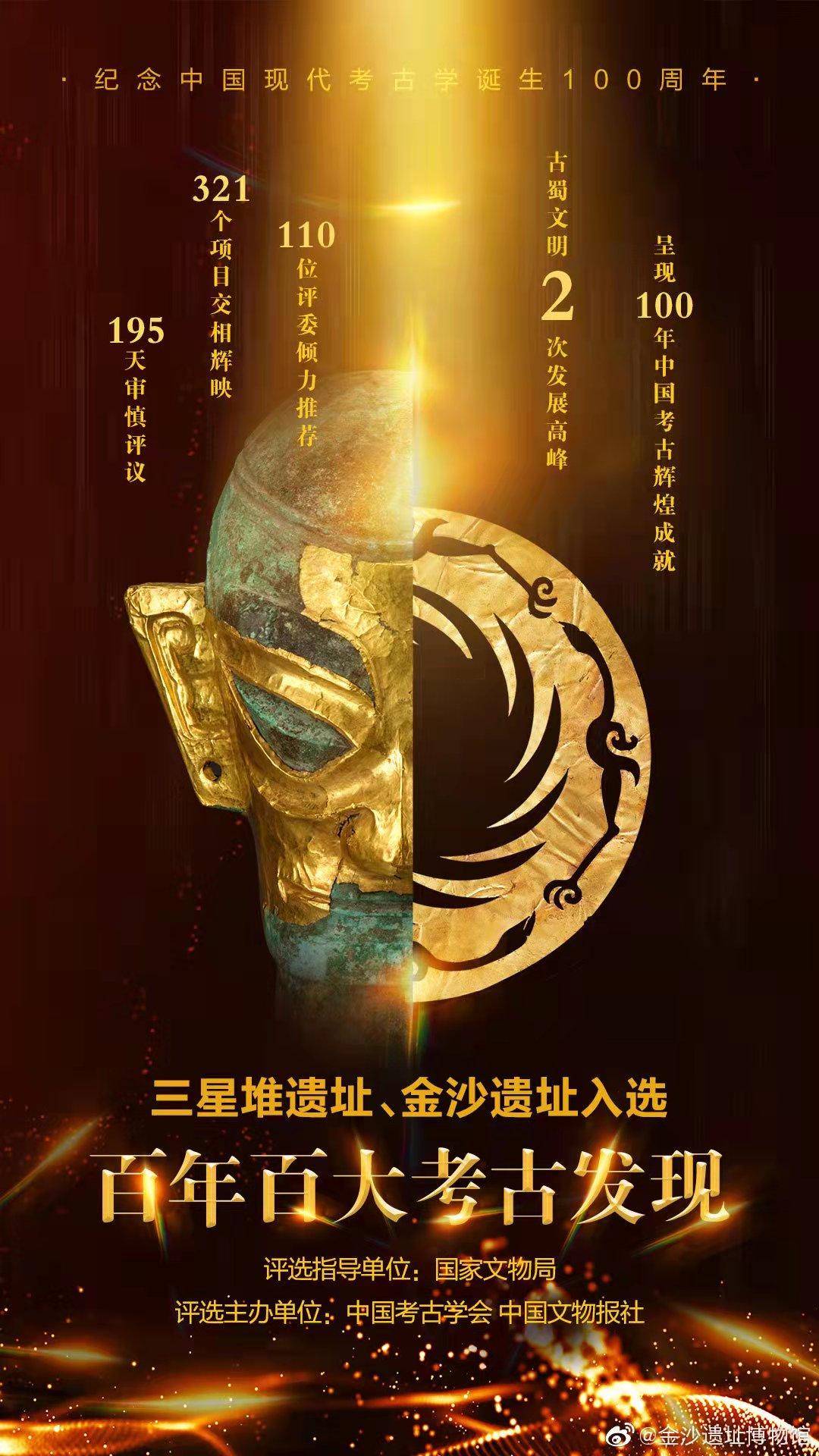 今年是中国现代考古学诞生一百周年,中国考古学会、中国文物报社5月启动了“百年百大考古发现遴选推介活动”,最终,成都金沙遗址脱颖而出,入选“百年百大考古发现”。