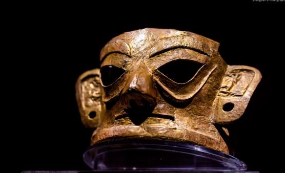 ↑金沙遗址博物馆镇馆之宝:太阳神鸟金饰与黄金面具