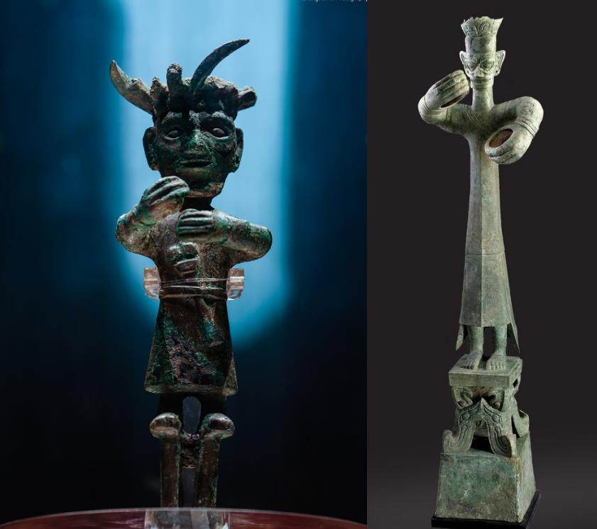 ↑金沙遗址出土的青铜立人(左)、三星堆遗址出土的青铜立人(右)